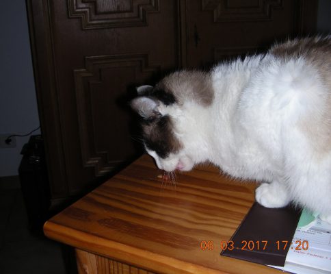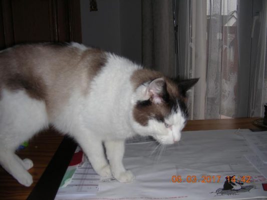 „Ich wurde im Untergeschoss (Keller,Vorratsraum,Holz+Katzenraum mit eigenem Eingang für meinen späteren Freigang) aus meiner Transportkiste gelassen. Nach der ersten Besichtigung habe ich beschlossen im Keller zu bleiben. Mein Fress- und Wassernapf sowie mein Katzenklo stehen hier unten. In der Nacht auf Sonntag habe ich mich weiter im Haus umgesehen und habe noch einen Trockenfutternapf in der Küche entdeckt. Heute habe ich meine Dosenöffner dazu bewegt mich zu bürsten und anschließend haben wir noch 20 Min. mit der Angel und 2 Bällen gespielt. Danach hatte ich Hunger und wurde sehr müde !! Zum Schlafen gehe ich wieder ins Untergeschoss und lege mich in ein gut sortiertes Vorratsregal. Ich will hier bestimmt nicht mehr weg. “