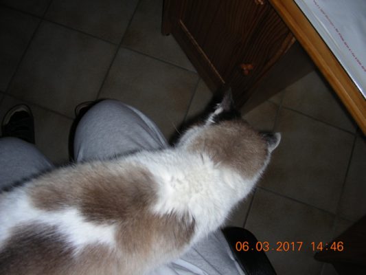 Oria heißt nun Lissy. Am ersten Abend hat Lissy es sich im Untergeschoss/Keller gemütlich gemacht. Nachts war sie auf Erkundungstour und hat sich alles angeschaut. Mittlerweile hat sie ihre Männer wohl schon um die Pfoten gewickelt.