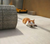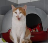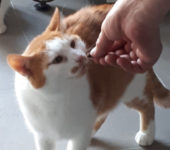 Polochon ist ein ruhiger und lieber Kater. Als er beim Leckerli verteilen heftig von einer anderen Katze angefaucht wurde hat er sich einfach hingesetzt und sich nicht beeindrucken lassen.