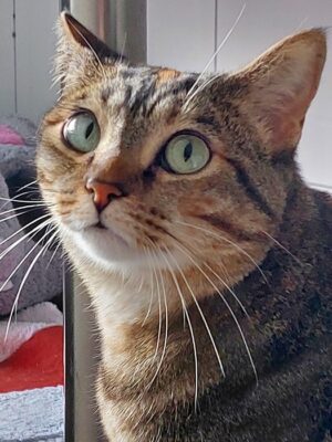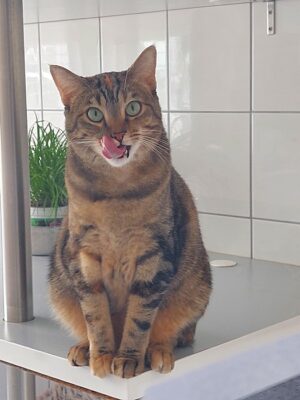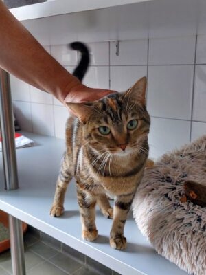 Die erste Woche war kein Rankommen an sie, sie hat gefaucht und geschlagen und sich nur versteckt. Inzwischen lässt sie sich von einer Mitarbeiterin schon gerne streicheln und auch wir durften sie streicheln, da war sie aber noch vorsichtig. Gesucht wird ein ruhiges Zuhause.