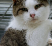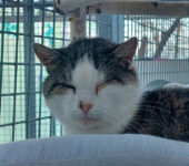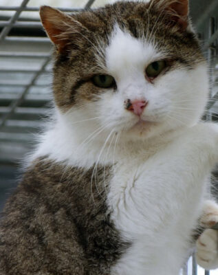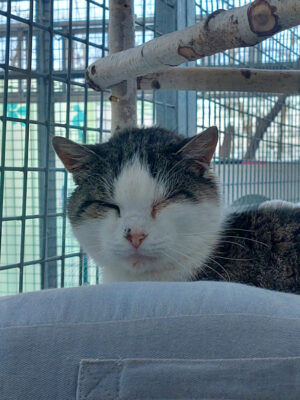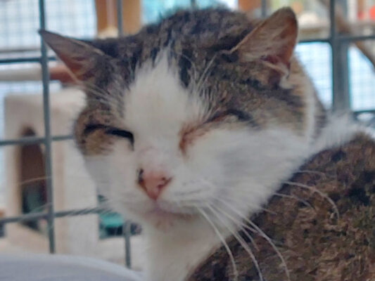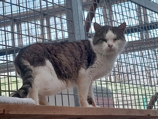 Playne ist noch ein wenig zurückhaltend. Er lässt sich zwar streicheln, fühlt sich dabei allerdings noch nicht richtig wohl. Im Moment hat er eine Bindehautentzündung, die behandelt wird.