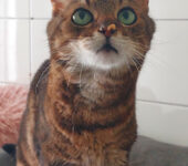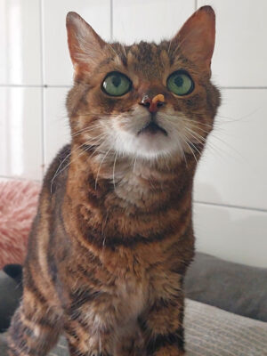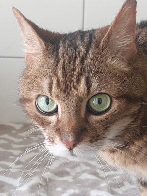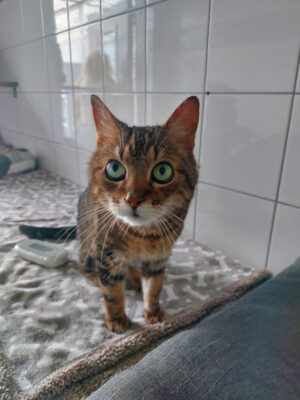 Der Besitzer von Zamnesia musste ins Pflegeheim und Zamnesia kam mit drei weiteren Katzen ins Tierheim. Sie kommt sofort, ist neugierig und lässt sich direkt streicheln.  Allerdings bestimmt sie auch, wann es genug ist. Da gibt es kurz einen Tatzenhieb, dann kommt sie direkt wieder.