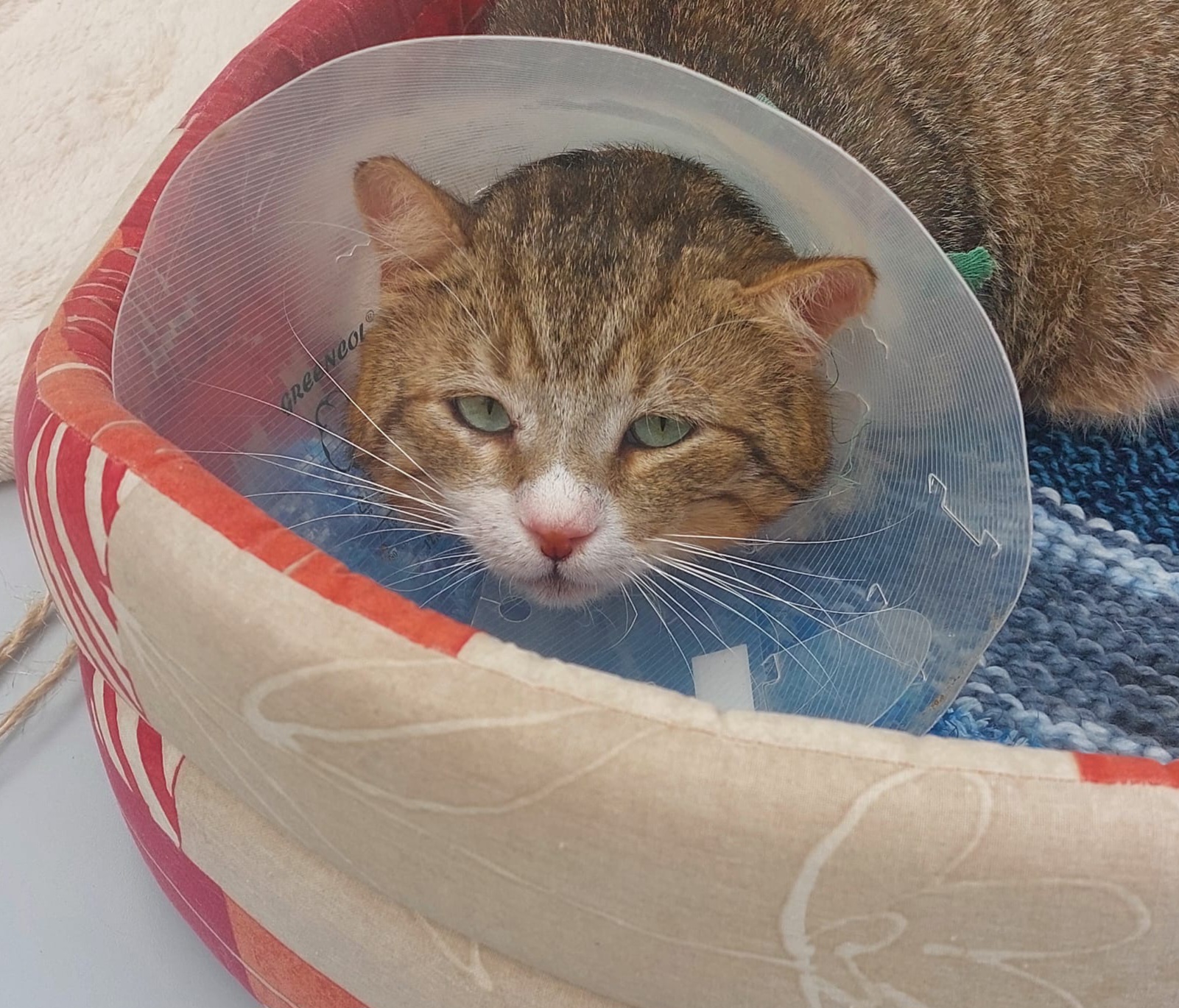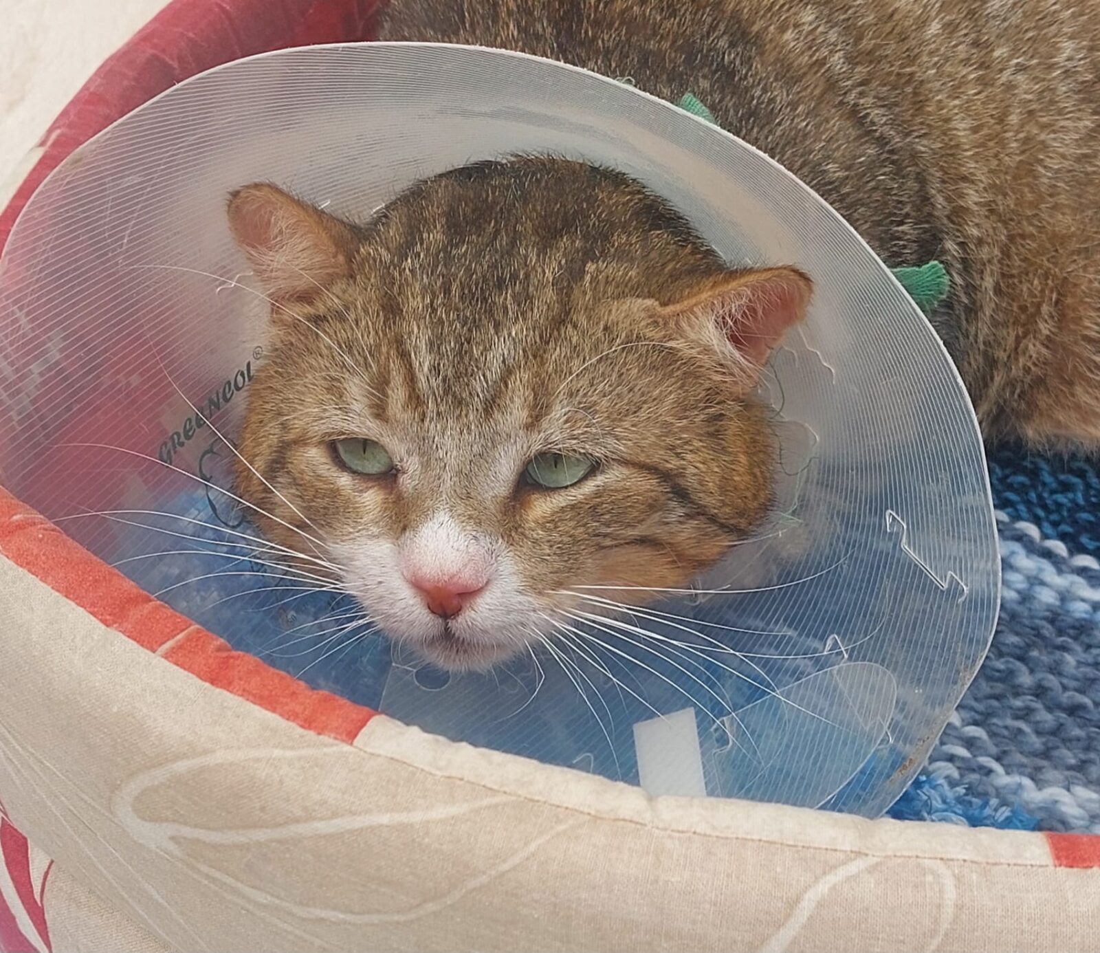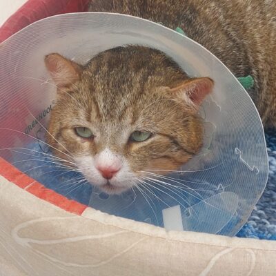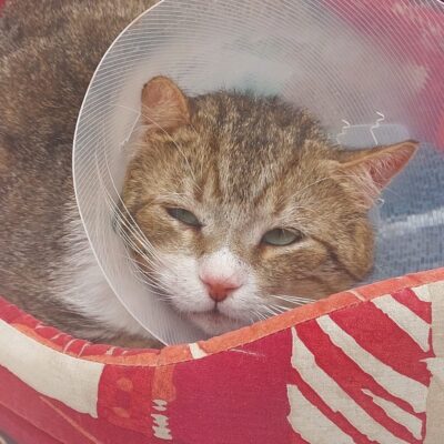 Abel ist ein schüchterner, aber sehr lieber Kater. Im Moment muss er eine Halskrause tragen, da ein Abszess am Rücken eröffnet werden musste.