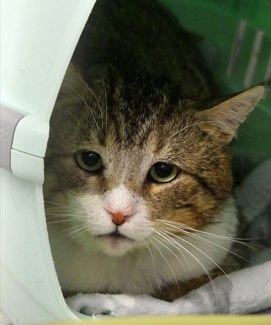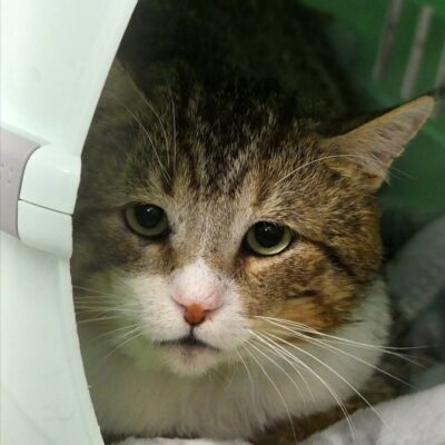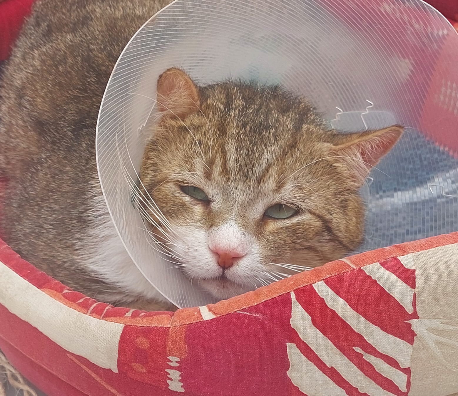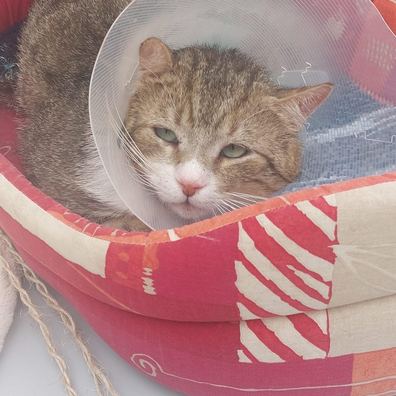 Abel ist ein schüchterner, aber sehr lieber Kater. Im Moment muss er eine Halskrause tragen, da ein Abszess am Rücken eröffnet werden musste.