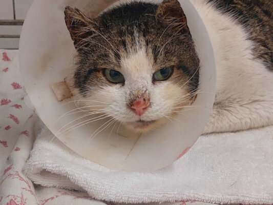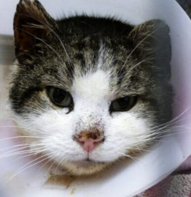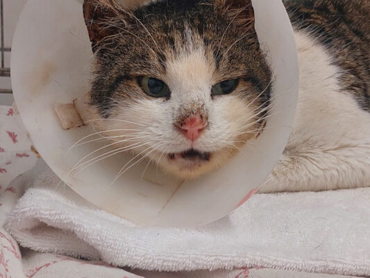 Vesemir hatte zahlreiche kleine Wunden und einige Abszesse am Körper. Er faucht meist direkt. Wenn man sich ihm ruhig nähert, lässt er sich auch streicheln.