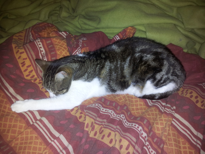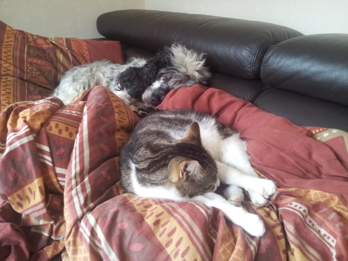 « Minette a été rebaptisée P’tite Maman. Je l’ai récupérée en famille d’accueil avec ses 2 bébés, qui ont été rapidement adoptées ensemble. Il lui a fallu du temps pour s’adapter, c’est pourquoi je n’ai plus voulu la placer et lui infliger encore le stress d’un déménagement. Au début, tout n’a pas été simple pour elle avec les chiens et les autres chats. Ce n’est toujours pas optimal : seuls Foupi et Silver sont acceptés sans grognements. C’est une indépendante qui a besoin qu’on la laisse tranquille.