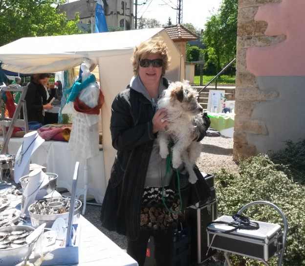 En visite chez Filou sur le marché d’art et de créations. Sa propriétaire créé des bijoux et les a exposés, et Filou a eu le droit de venir avec.