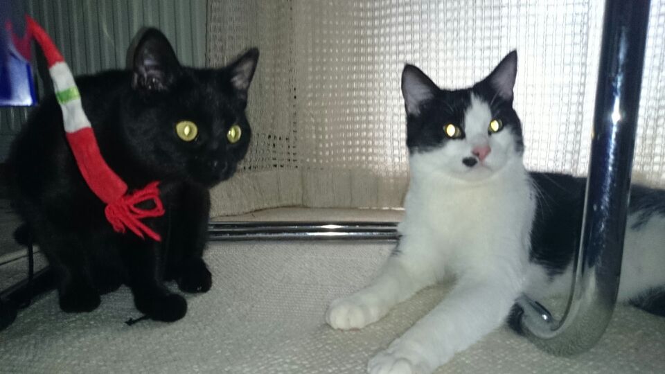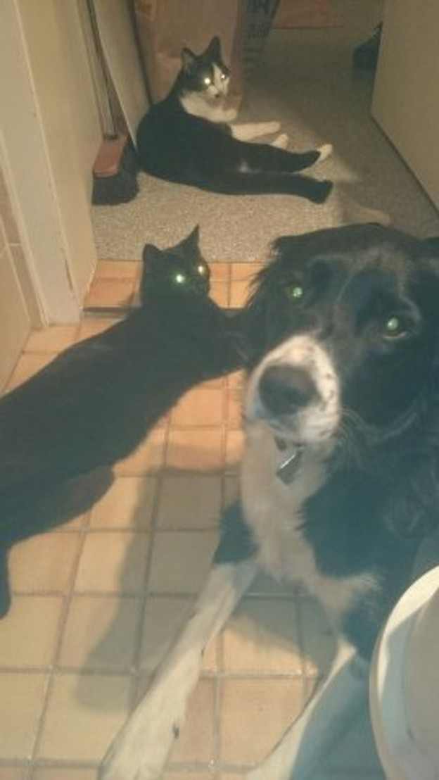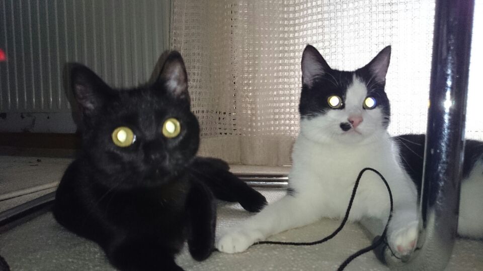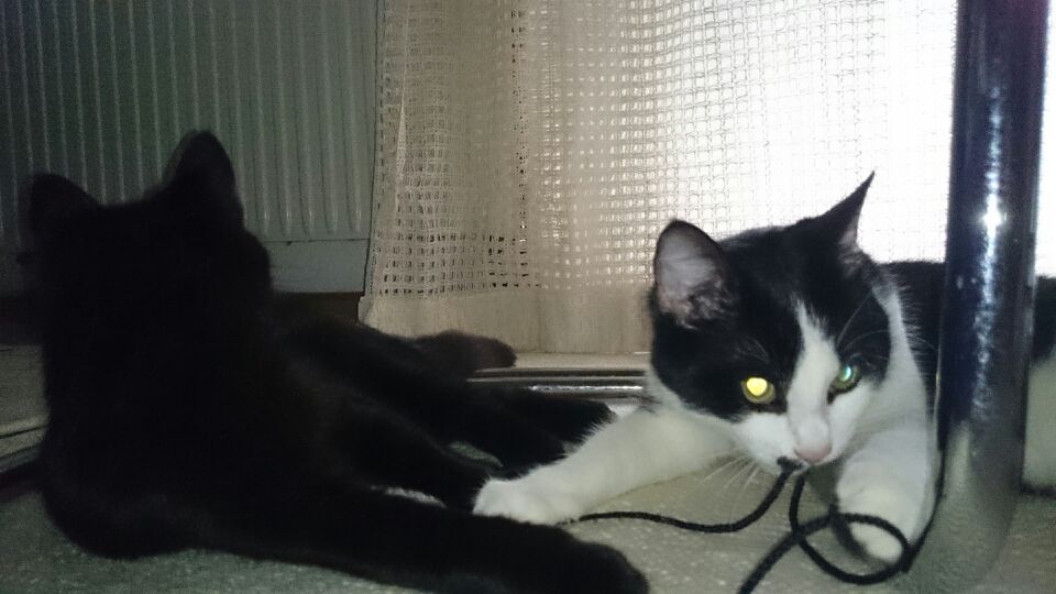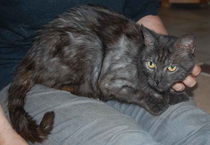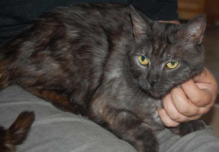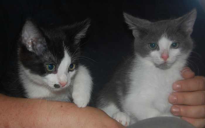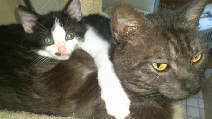Avec les chiens ils s’entendent bien, et passent entre leurs pattes. Les 2 savent très bien quand le chien a envie de jouer à la course-poursuite dans la maison, et quand non. De temps en temps ils se blottissent les uns contre les autres, où quand les chats se trouvent à la hauteur des chiens, ils les lèchent. De même, avec les chats plus âgés pas de problème. Cependant on ne peut les prendre dans les bras que peu de temps, mais lorsqu’ils sont au sol ils se laissent faire pour des caresses sans fin sans problème. Gemma essaye toujours de se blottir dans ma main avec sa tête, et adore se faire caresser la tête, puis ensuite elle montre son ventre en s’étirant. Ils écoutent quand on les appelle par leur nom, et quand on se fait discret, l’un court vers l’autre 🙂 «