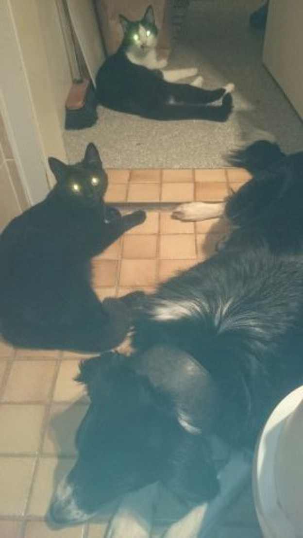 « Peu importe où je suis, dans quelle chambre je vais, Gwain et Gemma me suivent partout. A peine allongé, Gwain et Gemma viennent se blottir contre ma gorge. Je le caresse, et si je ne fais pas attention à son museau il me pince légèrement. Souvent je me réveille le matin et les 2 sont déjà blottis contre moi, prêts à être caressés. Si jamais Gemma ne s’est pas rendue compte d’où j’étais, elle m’appelle. De temps à autre ils sont vraiment agités et parfois un peu bruts l’un avec l’autre.