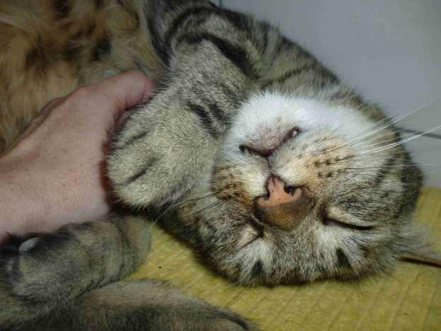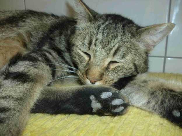Grisou n’est pas depuis longtemps au refuge. Encore un autre matou super mignon et câlin. Il est un peu gros, un petit régime ne lui ferait pas de mal. Quand je l’ai vu pour la première fois il y a 3 semaines il m’a déchiré le coeur. Un superbe matou. Sur les photos on voit comme il est mignon quand il se blottit. Une des plateformes sur l’arbre à chats est sa place préférée pour dormir. Quand je commence à le caresser il se met tout de suite sur le dos et veut vraiment être cajolé.
