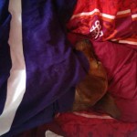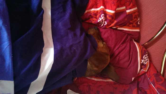 On lui apprend tous les jours à rester seule, ça fonctionne plus ou moins bien. Durant les premières minutes elle pleure, elle a bien évidemment envie de venir avec nous, mais ensuite elle se calme et va se coucher. Ce qu’elle préfère c’est s’enrouler dans la couverture du lit, et dès qu’on va se coucher elle vient et a envie de se blottir contre nous, ça elle sait faire 🙂 Elle aime bien se blottir contre Léon aussi, elle a beaucoup de patience avec lui.