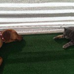 Quelques photos de Holly dans son ancien foyer d’accueil temporaire, avec Léon et le chat:
