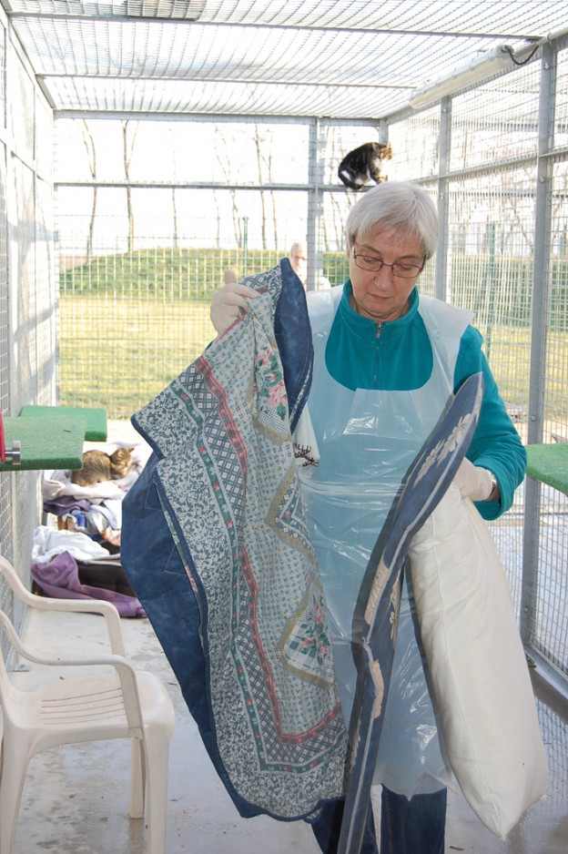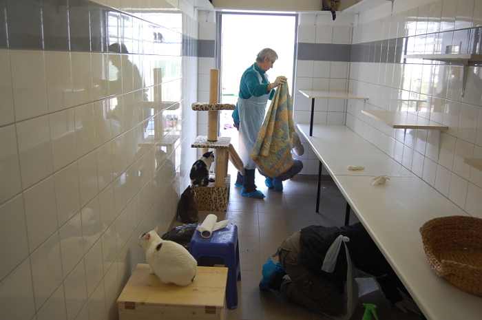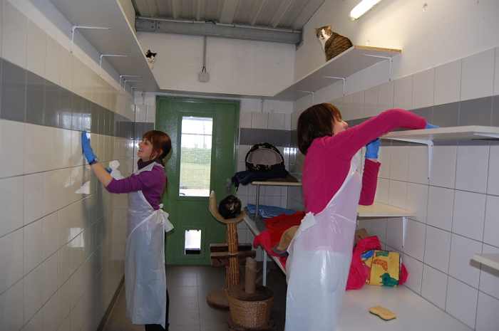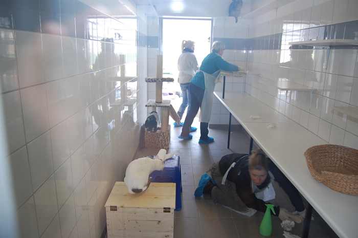 Les différents boxes de la chatterie ont été nettoyés et désinfectés. De même, les arbres à chat ont été réparés ou remplacés par des nouveaux. Les chats ont dans l’ensemble été très coopératifs, et toujours là lorsqu’il s’agissait de découvrir quelque chose de nouveau !