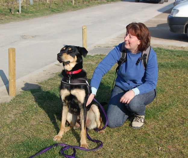 Les premiers mètres, il tire énormément, il me traîne derrière lui, il a de la force. C’est pourquoi je décide de travailler un peu la marche en laisse. C’est moi qui décide de la direction à prendre, je ne le laisse plus me dépasser, et je change sans arrêt de direction. Il commence à comprendre qu’il y a une personne à l’autre bout de la laisse, et qu’il ne faut pas tirer. Il marche plus doucement, et recherche même le contact visuel. Après quelques temps, cela va nettement mieux, et je le mets en longe pour qu’il ait plus de liberté.