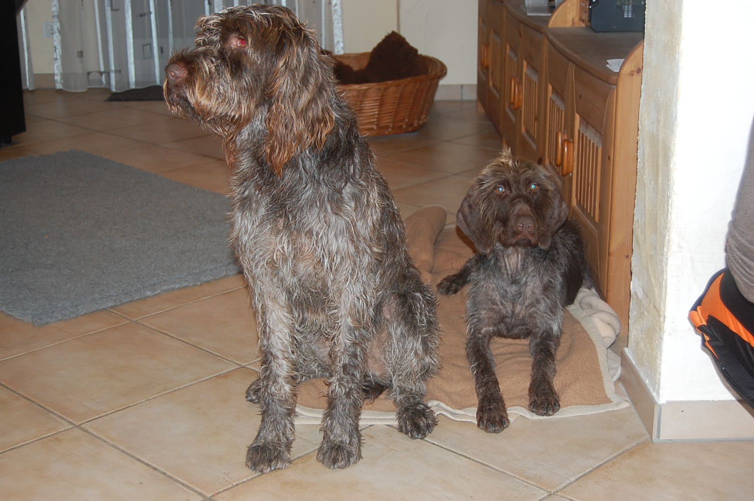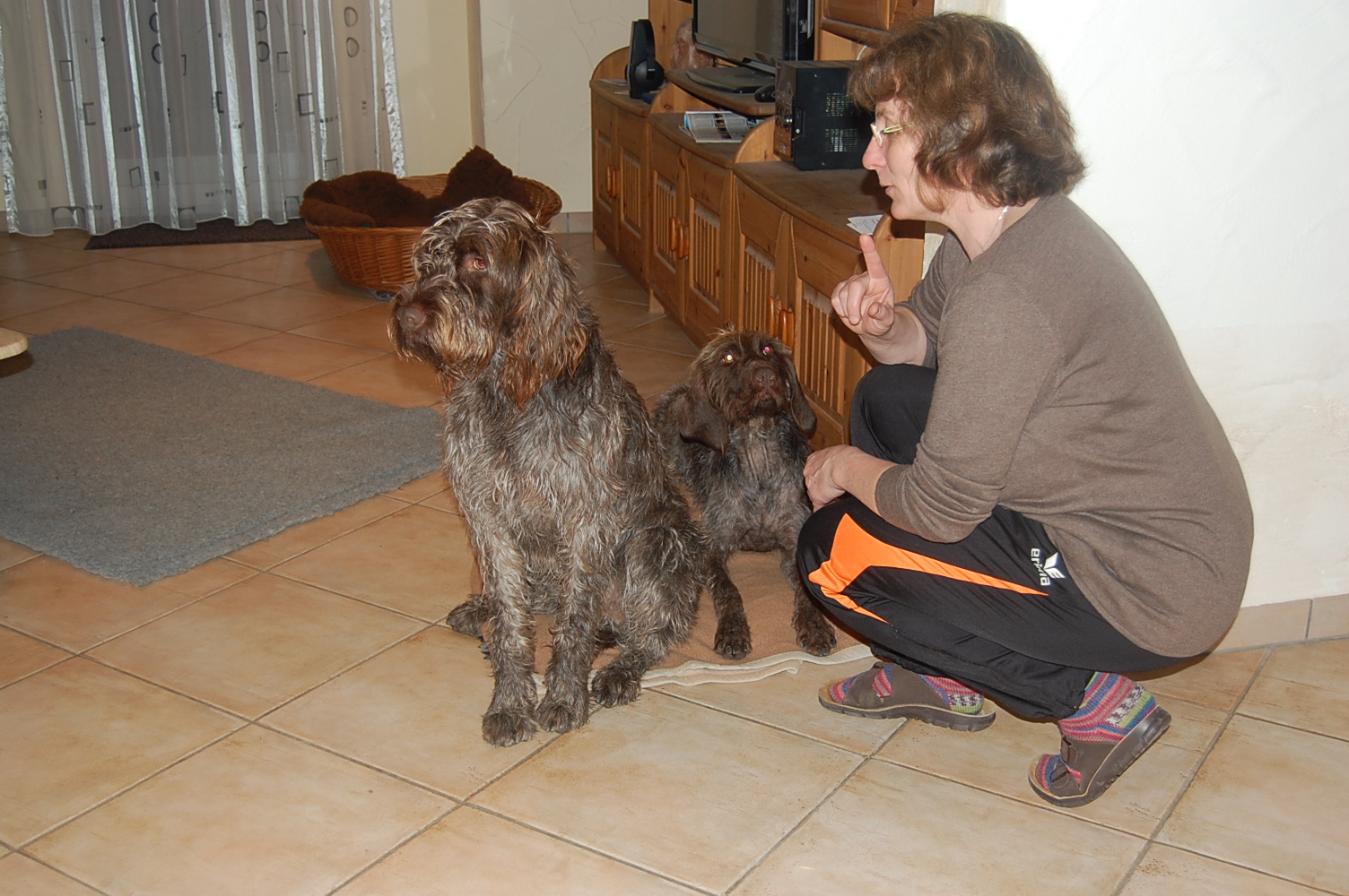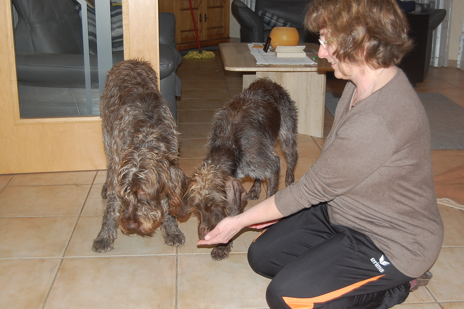 En visite chez Wendy, à présent Mandy. Mandy et Goliath s’exercent rigoureusement tous les jours dans leur foyer d’accueil: lorsque ça sonne, ils doivent restent tous deux assis à leur place. Ca ne fonctionne pas toujours parfaitement, mais l’exercice est régulièrement mis en pratique. Sur ordre, ils ont le droit d’aller accueillir le visiteur, quoique la plupart du temps encore avec trop d’enthousiasme ! Wendy s’appelle désormais Mandy et est très câline, avec Goliath il faut d’abord être un peu patient avant qu’il accorde sa confiance, sinon il se montre méfiant et peut grogner. Cependant sa curiosité et son intérêt pour les friandises l’emportent 🙂 Toutefois, il recule encore d’un air effrayé lorsqu’on lui présente sa main en venant d’en haut. Il n’a pas dû faire d’agréables expériences dans le passé…