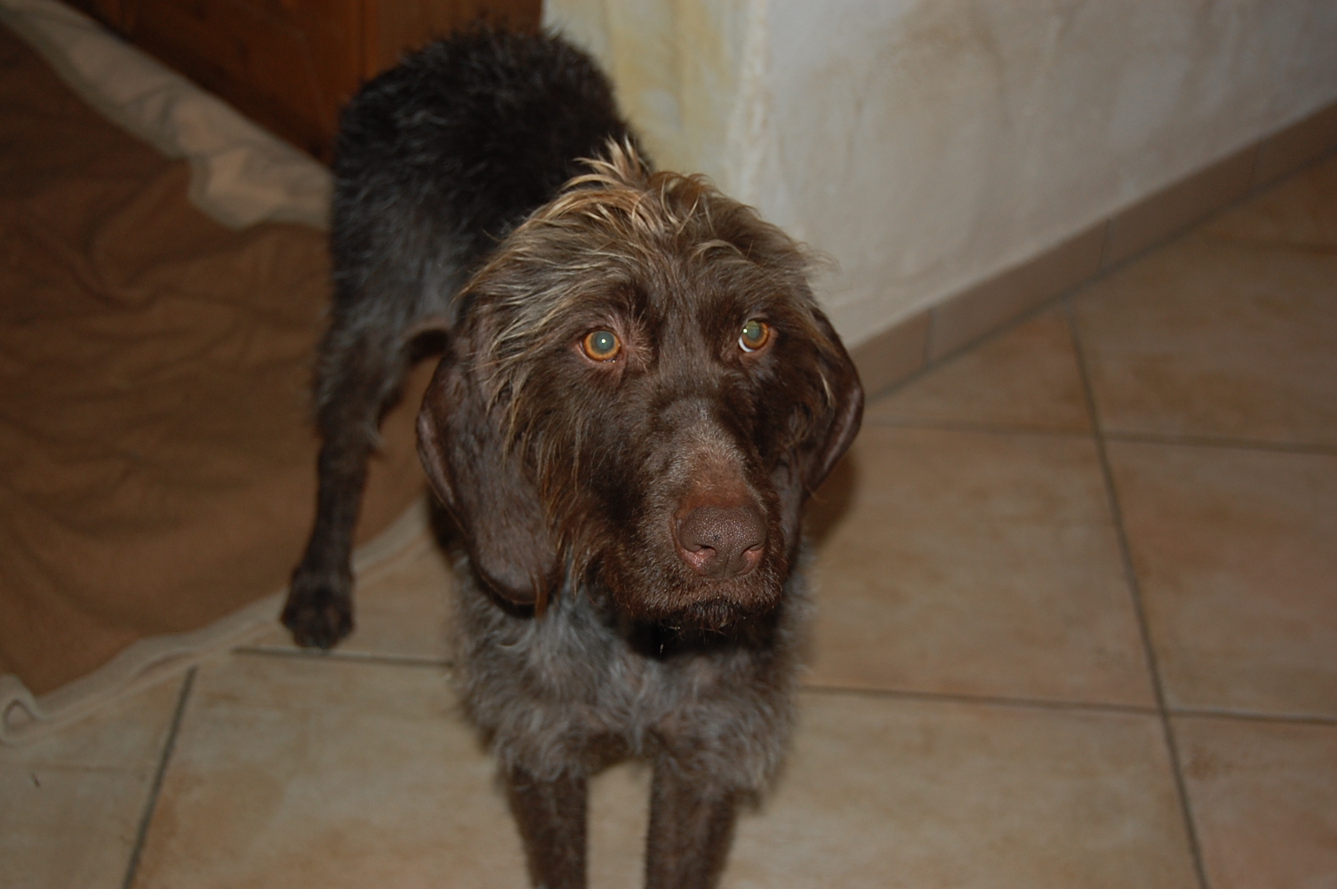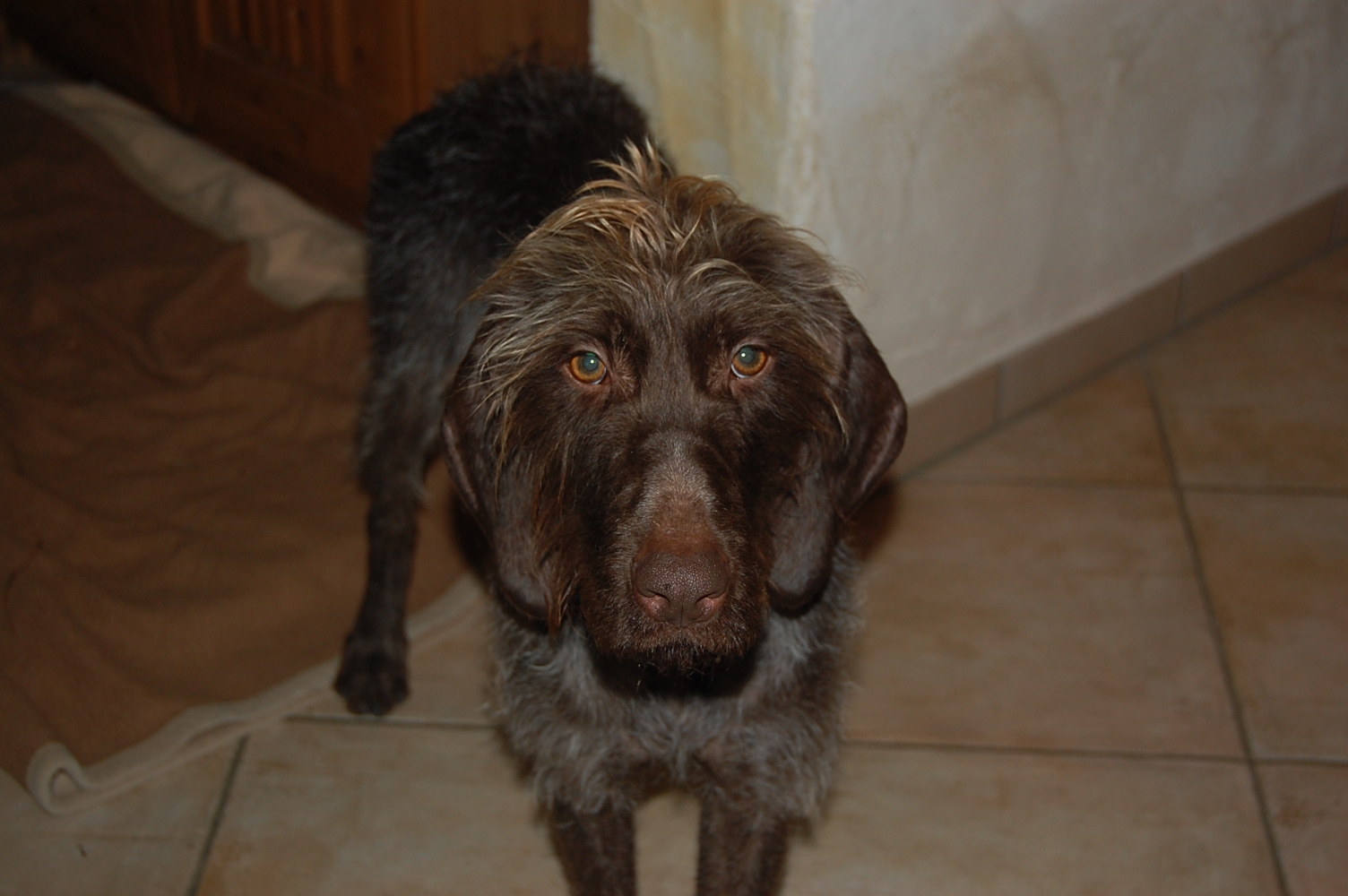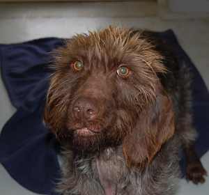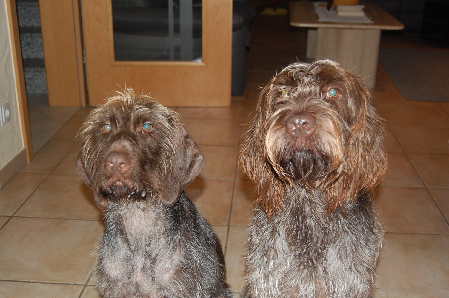 En visite chez Wendy, à présent Mandy. Mandy et Goliath s’exercent rigoureusement tous les jours dans leur foyer d’accueil: lorsque ça sonne, ils doivent restent tous deux assis à leur place. Ca ne fonctionne pas toujours parfaitement, mais l’exercice est régulièrement mis en pratique. Sur ordre, ils ont le droit d’aller accueillir le visiteur, quoique la plupart du temps encore avec trop d’enthousiasme ! Wendy s’appelle désormais Mandy et est très câline, avec Goliath il faut d’abord être un peu patient avant qu’il accorde sa confiance, sinon il se montre méfiant et peut grogner. Cependant sa curiosité et son intérêt pour les friandises l’emportent 🙂 Toutefois, il recule encore d’un air effrayé lorsqu’on lui présente sa main en venant d’en haut. Il n’a pas dû faire d’agréables expériences dans le passé…