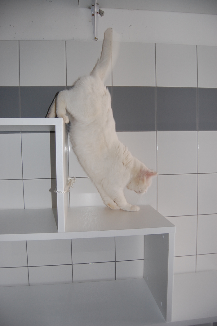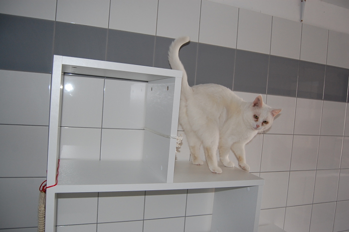 Un prototype a d’ores et déjà été réalisé : ce sont des étagères entièrement recouvertes d’un revêtement, nettoyables et mobiles afin de répondre aux recommandations en matière d’hygiène. Il y a plusieurs niveaux. Ainsi les chats seniors qui ne peuvent plus très bien sauter sur les tablettes en hauteur pourront en bénéficier. Les étagères seront aussi de possibles points de départ pour les chats qui veulent faire un petit tour de la chatterie. Nous y avons aussi fixé un grand griffoir et sécurisé l’ensemble pour que les étagères ne se renversent pas.
